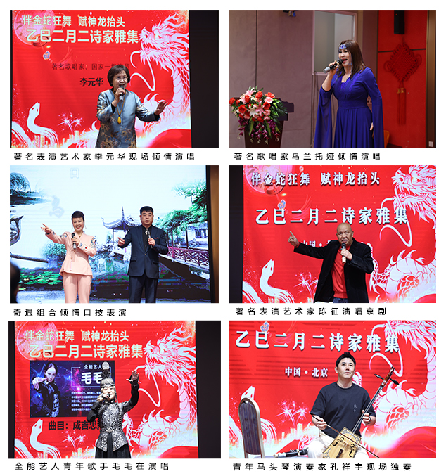 整个上午,与会诗人、艺术家,寄真情于词采,放浩然于形骸。活动开场,刘迅甫声情并茂的朗诵了李栋恒将军的《龙抬头之歌》拉开了“乙巳二月二诗家雅集”活动的序幕。整个上午活动形式多样,精彩纷呈,气氛热烈,高潮迭起,每位艺术家尽情壮歌新时代美好生活,一首首诗词歌赋,一个个出彩节目,表达了对生命的感悟,对生活的礼赞,彰显了新时代艺术家传递正能量,助力中华民族伟大复兴的自觉使命与责任担当。