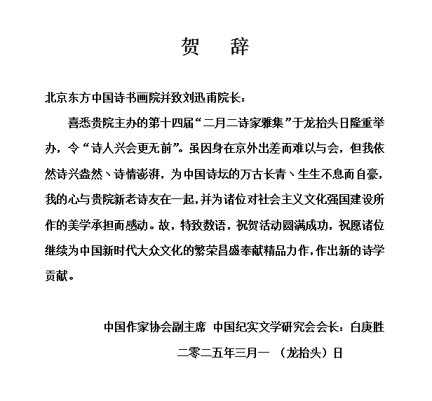 全国政协常委、中国作家协会副主席、中国作家协会全国委员会委员、中国纪实文学研究会会长白庚胜特发贺信表示祝贺:“喜悉第十四届‘二月二诗家雅集’于龙抬头日隆重举办,令‘诗人兴会更无前’。虽因身在京外出差而难以与会,但我依然诗兴盎然、诗情澎湃,为中国诗坛的万古长青、生生不息而自豪,我的心与贵院新老诗友在一起,并为诸位对社会主义文化强国建设所作的美学承担而感动。故,特致数语,祝贺活动圆满成功,祝愿诸位继续为中国新时代大众文化的繁荣昌盛奉献精品力作,作出新的诗学贡献”。