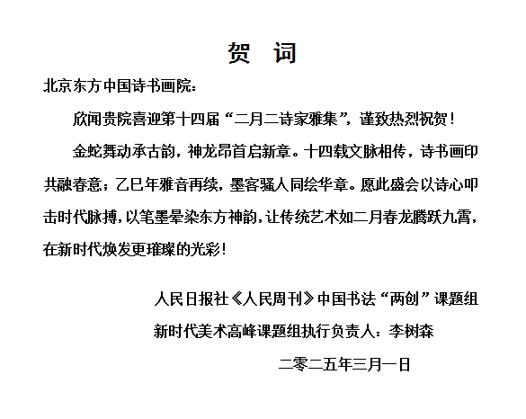 人民日报社《人民周刊》中国书法“两创”课题组、新时代美术高峰课题组执行负责人李树森发贺信表示:“欣闻贵院喜迎第十四届“二月二诗家雅集”,谨致热烈祝贺!金蛇舞动承古韵,神龙昂首启新章。十四载文脉相传,诗书画印共融春意;乙巳年雅音再续,墨客骚人同绘华章。愿此盛会以诗心叩击时代脉搏,以笔墨晕染东方神韵,让传统艺术如二月春龙腾跃九霄,在新时代焕发更璀璨的光彩”!祝贺“乙巳二月二诗家雅集”圆满成功。