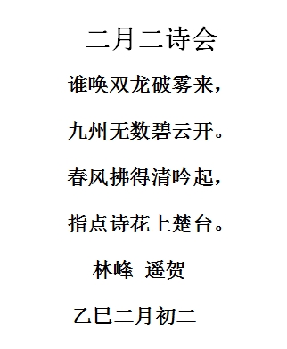 中华诗词协会常务副会长林峰、中华诗词协会副会长高昌闻讯特从外地发来贺诗,以表对“乙巳二月二诗家雅集”活动的祝贺之情。