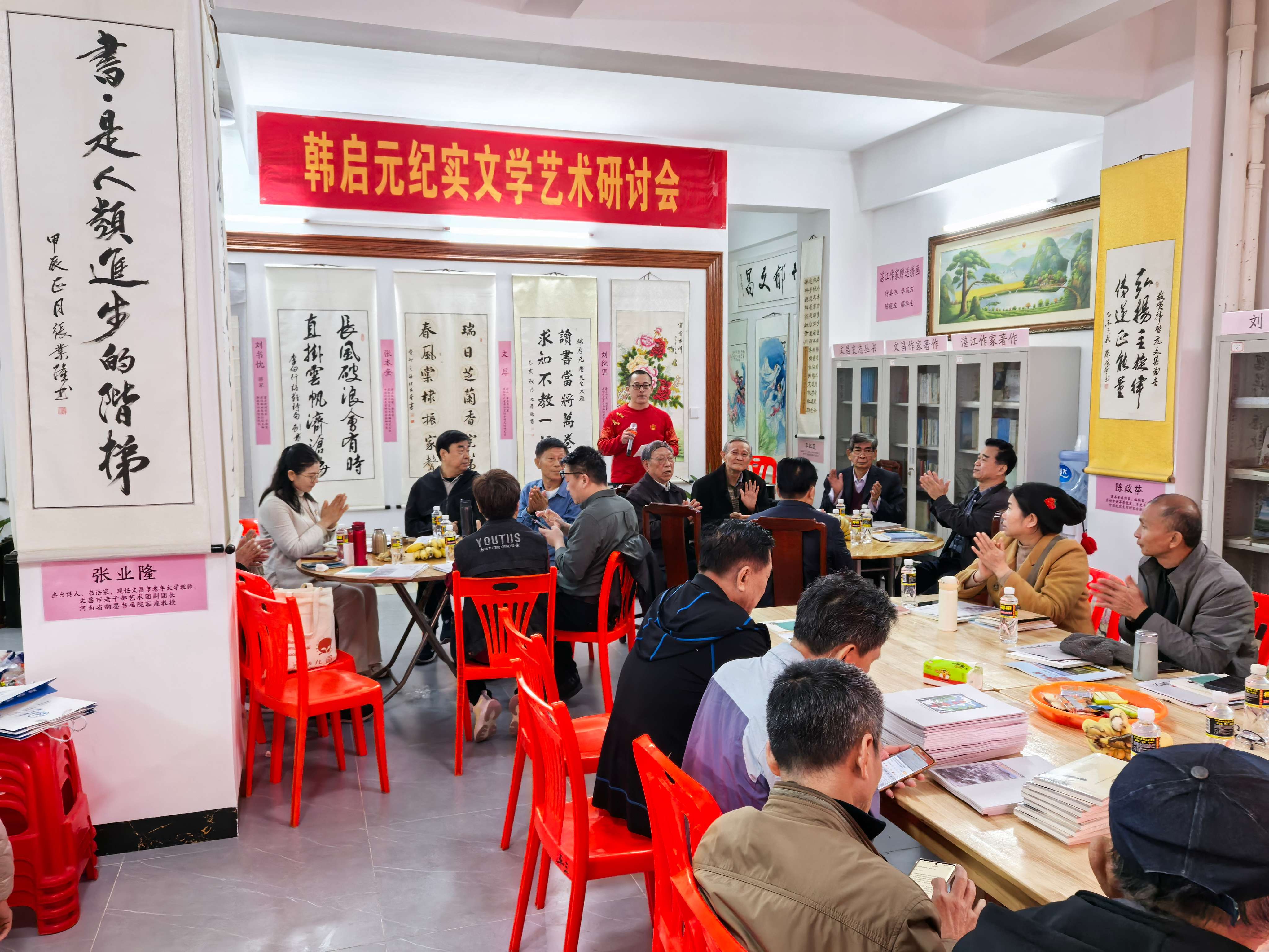 应该说,韩启元作品的顺利出版和深远影响,与中国纪实文学研究会老会长、著名作家刘佳的全力支持密不可分。党的十八大以后,在刘佳会长的精心运筹和全力操持下,文昌第一家自费建立的文化场所、革命传统教育基地——韩家书院落成。韩家书院是韩启元先生与刘佳先生共同创办的以传播革命历史、纪念革命英烈、厚植家国情怀、宣传革命精神,集展览、阅读、研究、创作、收藏于一体的、优良传统与时代新潮交流融汇的文化书院。五百平方米的展厅宽敞明亮,众多展品的布置典雅隆重,展示了韩老三十年精心创作的几百万字的作品,其中有琼崖纵队斗争的历史、琼文人民抗战的实录、南洋琼侨为国献身的写真。尤其珍贵的是,收藏了韩老三十年笔耕墨耘的全部手稿。在这些发黄的稿纸上,留有他当年写作时浸湿的一片片泪痕。可以想见,韩老的作品确实是滴滴血泪凝成的,是他心潮澎湃、老泪纵横、哭泣着写出来的啊。除此,展厅还陈列着各级政府为韩老颁发的百余个证书、奖状、奖章,彰显了他为人民作出诸多奉献的一生。同韩启元一样,著名作家刘佳也是一位文武双全、从战场走上文坛的老作家。这位援越抗美二级战斗英雄、一级作家的大部分作品,也进入了展柜,为这个革命传统教育基地增添了荣光。来到韩家书院的展厅,你会看到,韩老优秀的历史纪实文学作品,文采飞扬;刘佳诸多的文学创作精品,主旋高昂,文艺界名人的书卷画作,满目琳琅。观之,动人心魄;读之,荡气回肠;思之,意志昂扬。在文化繁荣、文学昌盛的文昌,韩家书院,真的是书香沁人、卷帙芬芳!流连展厅,凝望着韩启元老人照片那沧桑的身影、清癯的面容,深思的目光,感叹着展柜里他三十年创作的丰硕成果,谁都会认同,评论家们对韩老著作获奖的评语是多么的肯綮、何等的精准:他书写的海南革命历史,真实生动人物鲜活;他勾勒的琼文斗争画卷,深邃细腻激情如火;他讲述的琼岛华侨故事,宏大悲婉波澜壮阔……应该说,这不止是评论家们的真情赞许,也是广大读者的共识认同啊。基于此,真希望我们的当代作家都像韩启元老人一样,为血染的历史不被烟锁尘封,为民族复兴的中国梦成为愿景,挥洒自己多彩多姿的笔墨,歌颂民族英烈,弘扬中国精神,书写革命历史,高扬传统道德,向党的十八大之后开启的习近平的中国特色社会主义新时代奉献更多的史诗之作!