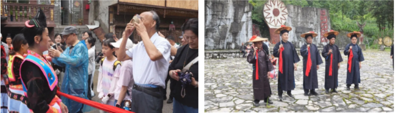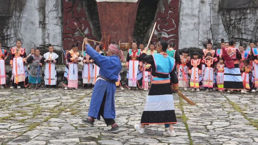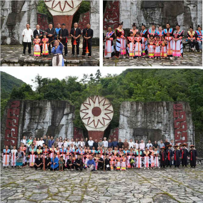 青山环抱的巴(身小)(lāng)苗寨,宁静而古朴。调研中,专家组一行先体验了热情好客的巴(身小)(lāng)村民在村口设置的“拦门酒”,紧接着和当地村民一起“打糍粑”“包糍粑”,深入感受苗族居民的特色风俗。在巴(身小)(lāng)苗寨文化广场,专家组一行认真聆听了资深东郎演唱的《亚鲁王》史诗中庄严肃穆的唱诵段落,特别是亚鲁王史诗创世纪等古老仪轨片段的吟唱,还观看了“迁徙舞”“后羿射日”等民俗表演。他们围坐在一起,详细询问表演内容,与传承人面对面交流,互留联系方式,用镜头记录下这些宝贵的场景。此次调研专家组一行还深入走访了当地村民旧居,充分了解村居民宅建筑中所蕴含的传统文化。