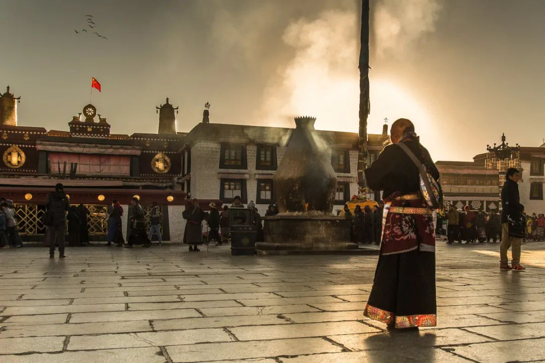 与布达拉宫的粗犷豪放完全不同,大、小昭寺在适当保留了松赞干布时期的主体建筑风格外,更兼具了浓厚的尼泊尔和唐代的味道,线条丰满而流畅,色彩富丽而堂皇。围绕着大昭寺的,就是著名的八廓街了。它位于古城拉萨的中心,是拉萨市保持得最完整的古街道,是拉萨的宗教、经济、文化、民族手工业以至西藏的风土人情的集结地。八廓街呈圆形,仿佛是一座巨大的时钟,辉煌壮丽的大昭寺就在它的中轴。而在我看来,八廓街其实是大、小昭寺的长长的裙裾和美丽的佩带。自古以来,八廓街都是藏传佛教信徒朝拜大昭寺内的释迦牟尼像的转经的最主要的线路,直至今天,同样还是每天都可以看见许多磕着三步等身长头的信徒来到这里虔诚朝拜佛祖。今天的八廓街已经成为拉萨一条最繁华的商业街, 大、小昭寺多样的建筑风格,虔诚朝拜的信徒,琳琅满目的手工艺品,各种各样的中外游客,此起彼伏的叫卖声,弥漫在空中的藏香、酥油茶和各类食物的阵阵香味,使得这里显得既古老又现代,既神秘又开放,总是让人们在这里流连忘返、乐不思蜀。
