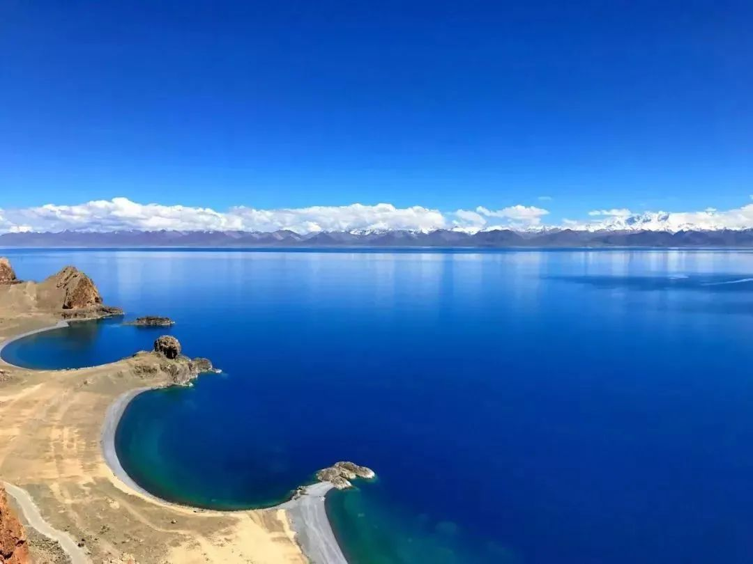 看啊,湖水是那样的浩渺,是那样的湛蓝,在灿烂的阳光下,熠熠发亮,好像是浮在草原之上的一块巨大的液体翡翠;远处是高耸入云、终年积雪的念青唐古拉山,像一位沉静而睿智的老人,默默地看护着广袤的湖水和草原;一群群嬉戏的鸥鹰在湖面上上下翻飞,呦呦的叫声和着哗哗拍岸的波浪,给眼前脱世绝尘的宁静平和增添了一种怡人的动感与氛围。
