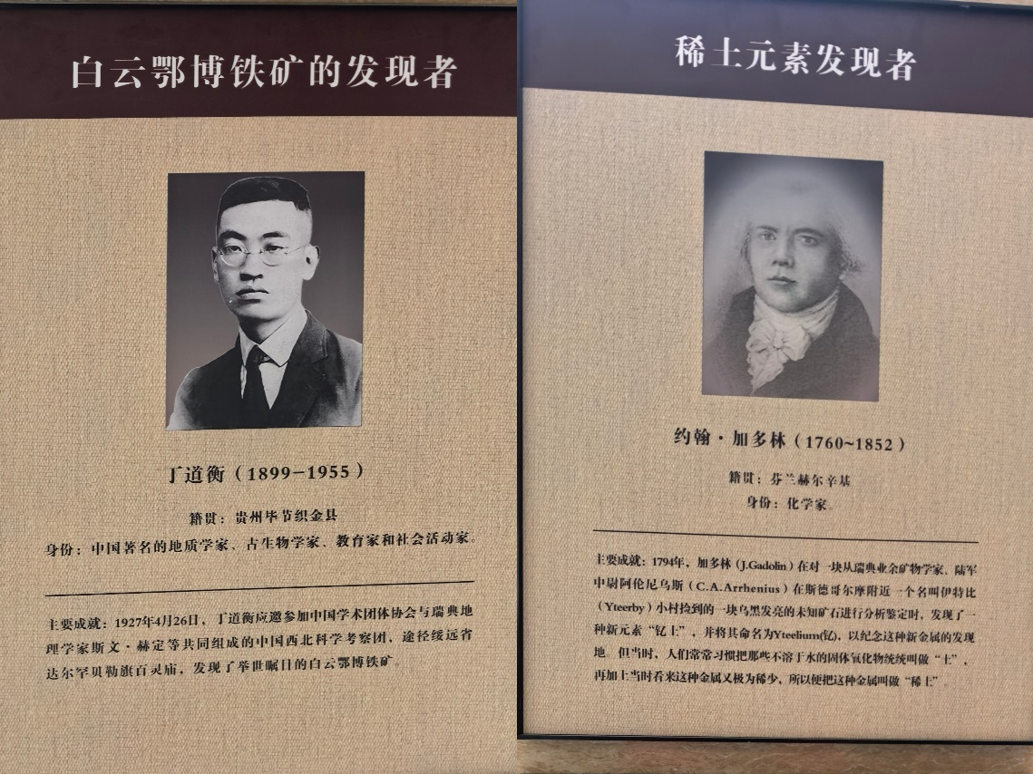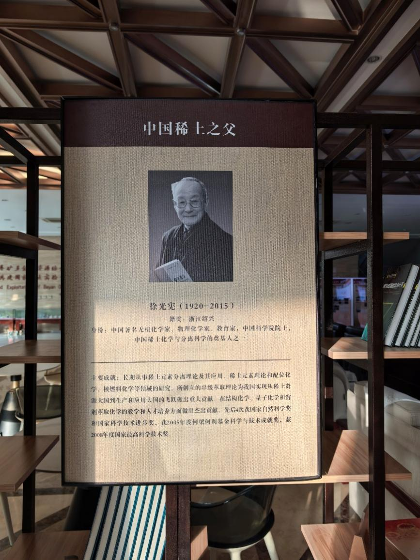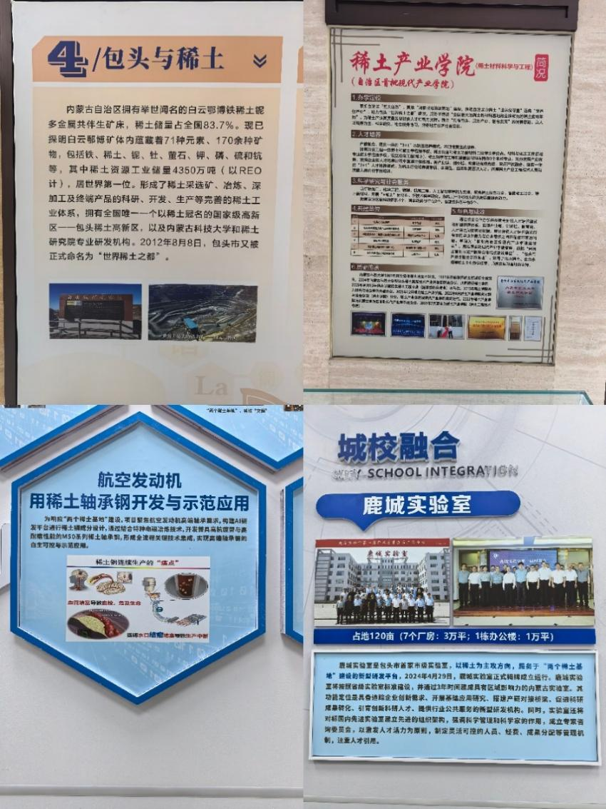 途经稀土学院一楼,大厅和走廊的稀土元素扑面而来。稀土元素发现者约翰·加多林、白云鄂博铁矿发现者丁道衡、中国稀土之父徐光宪每天微笑着迎接一批又一批传承人。稀土产业学院简况、包头与稀土、围绕稀土人才培养成果、航空发动机用稀土轴承钢开发与示范应用、鹿城实验室等展板记录着师生们付出奉献、艰难跋涉和报效祖国的宏伟志向。
