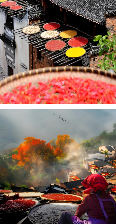 瞧!那一片一片的金,是玉米铺成的。饱满的棒子,被灵巧的手剥去了外衣,露出齐整整、黄澄澄的牙,密密地摊在苇席上,或是直接倾倒在扫得干干净净的院场上。阳光照下来,每一粒都像是一个小小的、吸足了光的“黄金”,亮晶晶的,仿佛能听见里面阳光流淌的、静谧的声音。那一片一片的红,是辣椒织就的。有整个儿串起来,挂在屋檐下、墙头边的,如一挂挂等待燃放的、沉默的爆竹;也有细细切碎了,在巨大的竹匾里摊开晾晒的,那红便不是一整片的了,是碎碎的,洋洋洒洒的,像哪个淘气的仙人打翻了胭脂盒,又像是一片流动的、炽烈的火,要把这秋天的微凉都给暖热了。