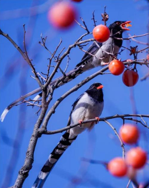 享用完美餐的鸟儿们并未急于离去。有的立于枝巅,细致地梳理着羽毛;有的三两相和,清脆的鸣叫声如碎玉般洒向四野。此刻,暖日、红柿、栖鸟,共同勾勒出一幅冬日最相宜的图画。这里没有喧嚣,唯有天地间最本真的静谧与和谐。