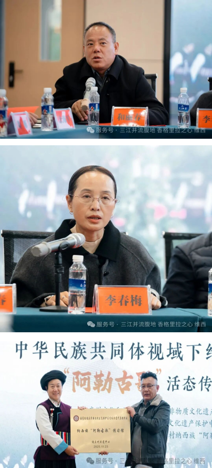 11月22日晚,与会专家首先观摩了“阿勒古歌”的完整演绎,实地感受其艺术形式与文化语境。23日上午,维西县文旅局局长和丽春主持了论坛的开幕式,中共维西县委常委、宣传部部长李春梅致欢迎辞。迪庆州非遗保护中心副主任斯那顿主向阿勒古歌传承协会授予“国家级迪庆民族文化生态保护区省级非遗代表性项目纳西族‘阿勒古歌’传习馆”牌匾,标志着其在系统化传承方面迈出关键一步。