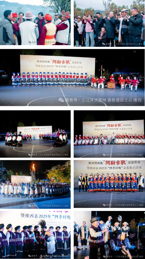 为深入探寻“阿勒古歌”的文化渊源与表现场景,24日上午,专家学者赴永春乡拖枝村开展田野考察,进一步厘清其文化边界与社会功能。当晚,维西县“四季村晚”示范展示活动同步举办,通过文艺汇演形式向各界嘉宾呈现了当地非遗保护成果与民族团结进步的生动实践。