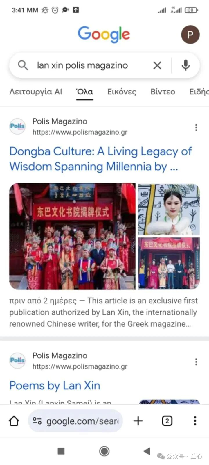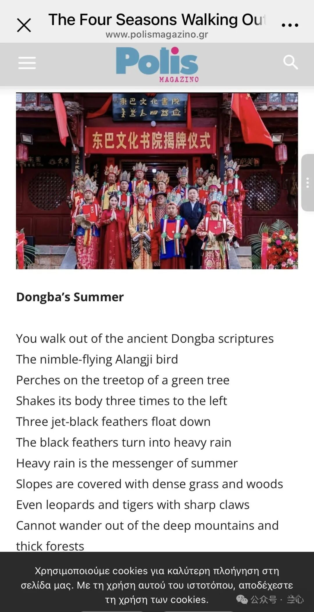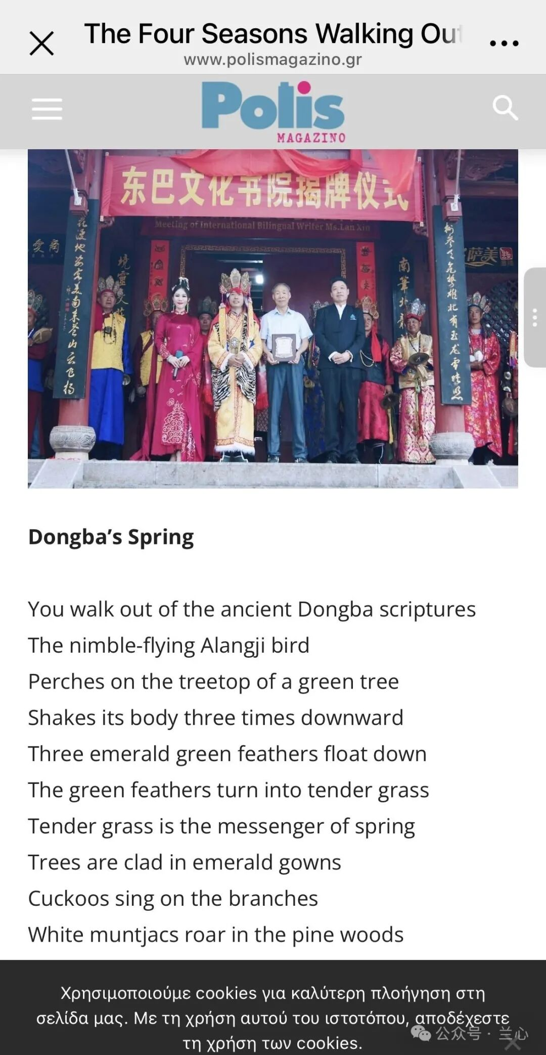 国际知名作家、玉龙文笔东巴文化书院院长、东巴文化传人兰心萨美,继1月15日在希腊国际知名期刊《Polis》杂志上发表东巴文化专栏开篇文章之后,17日,该杂志又刊登了兰心组诗《回归——从东巴经书中走来的四季》,同步收录于全球搜索引擎Google,让联合国教科文组织认证的世界记忆遗产——东巴文化,在欧洲舞台持续绽放光芒。