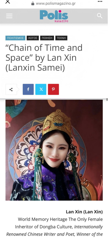兰心女士的原创诗歌《时空之链》,在被希腊国际著名作家诗人、《Polis》杂志国际版负责人伊娃 · 佩特罗普卢 · 利亚努(Eva Petropoulou Lianoy)翻译成希腊语并推荐,由《Polis》杂志CEO迈克尔 · 戈尼奥塔基斯(Michael Goniotakis)先生于1月20日同步发表于希腊国际学术期刊《Polis》与阿拉伯国际文化期刊《Almanar》后,1月23日经阿尔巴尼亚著名诗人、翻译家马耶塔 · 沙特罗 · 拉帕吉(Marjeta Shatro Rrapaj)翻译,以阿尔巴尼亚语又焕新呈现。