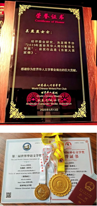 水孩儿的国际影响力,其来有自,并非一蹴而就。近年来,她的作品在国际文学领域获得了持续而扎实的认可,这构成了她影响力的第一重基石。其中最为瞩目的,是她的长篇非虚构作品《忽然而已》于2025年荣获“第二届国际冰心文学奖”“世界华语文学奖”。这个奖项并非寻常,它承续着一位中国作家(冰心)的世界性声名,并由联合国教科文组织和平中心支持,其评审视野具有明确的国际性。尤其值得注意的是该届获奖者的构成:既有英国诺贝尔文学奖得主古尔纳、美国诺奖得主索因卡这样的世界文豪,也有水孩儿与赵丽宏、张抗抗等中国作家。能够置身于这样的行列,本身就标志着她的作品在艺术深度与人文关怀上,已经进入了一个被国际专业领域严肃审视并高度认可的层面。此前,她的长篇小说《东家火西家烟》获得“世界华人周刊影视文学奖”,已引起轰动。《忽然而已》的获奖,则进一步证实了她作为一种“国际华语文学界的独特现象”的存在。