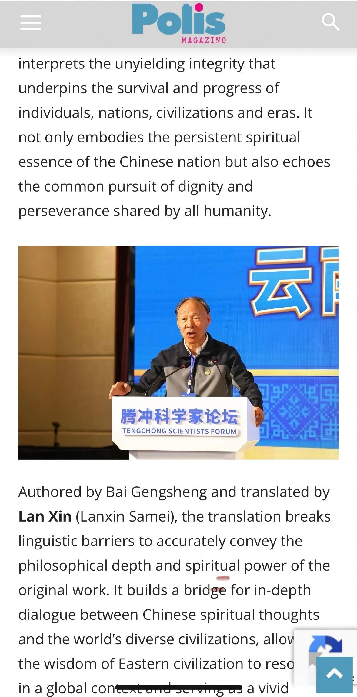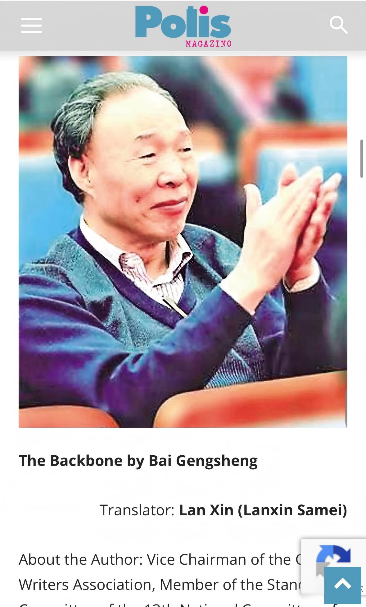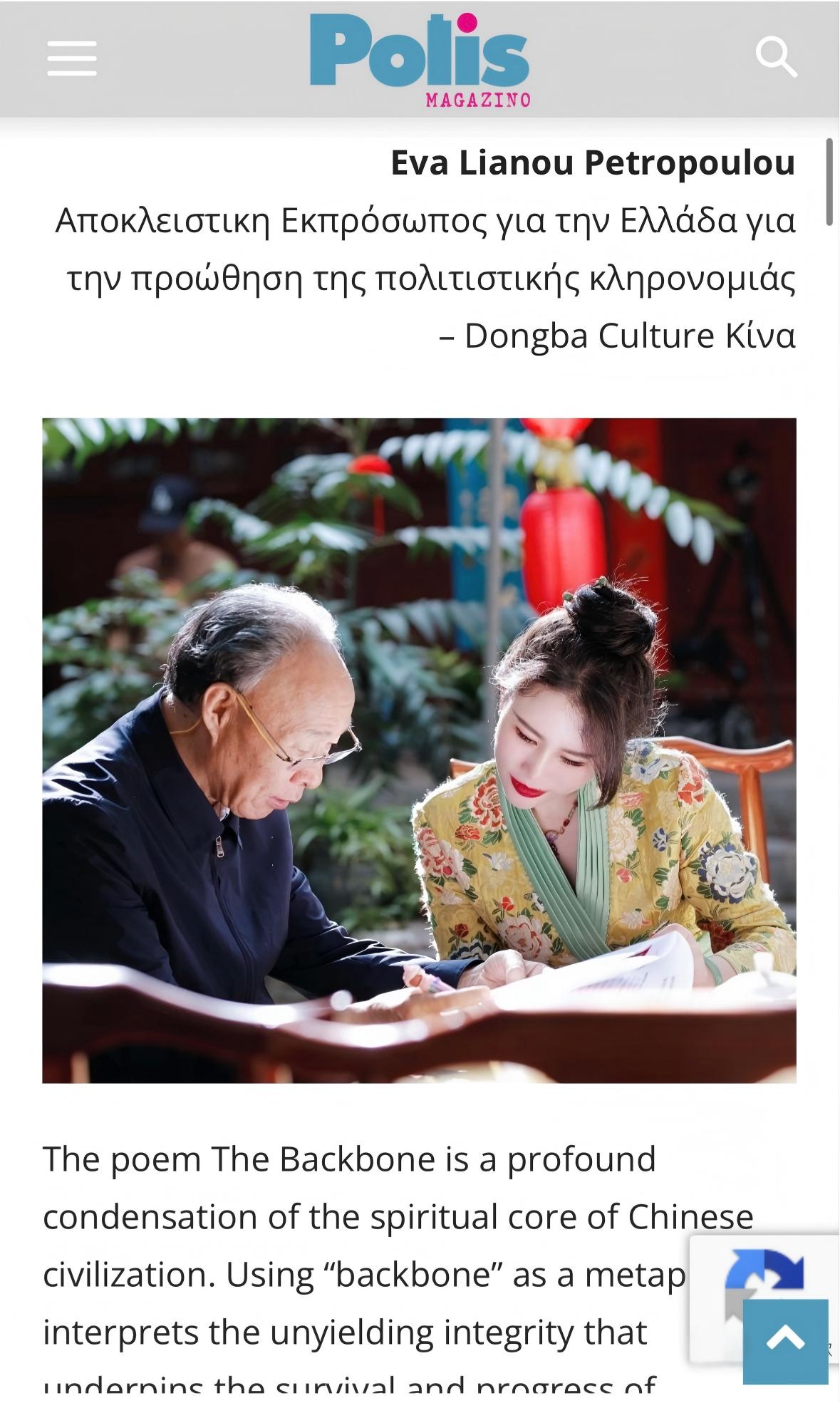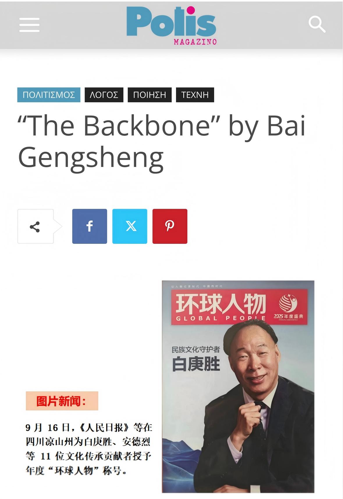 当东方哲思与希腊文明在文字中相遇,一首《脊梁》跨越山海,成为中希文化互鉴的又一见证。1月28日,中国作家协会副主席、十三届全国政协常委白庚胜的经典诗作《脊梁》,经国际知名作家/诗人、翻译家兰心译介,正式发表于希腊《Polis》国际期刊——这是白庚胜作品继《致爱妻》后再次登陆该刊。此前,《致爱妻》还曾发表于阿拉伯《灯塔》杂志(Almanar)。多部作品的跨国传播,标志着中国当代诗歌以更具精神厚度的姿态,走进全球多元文化视野。