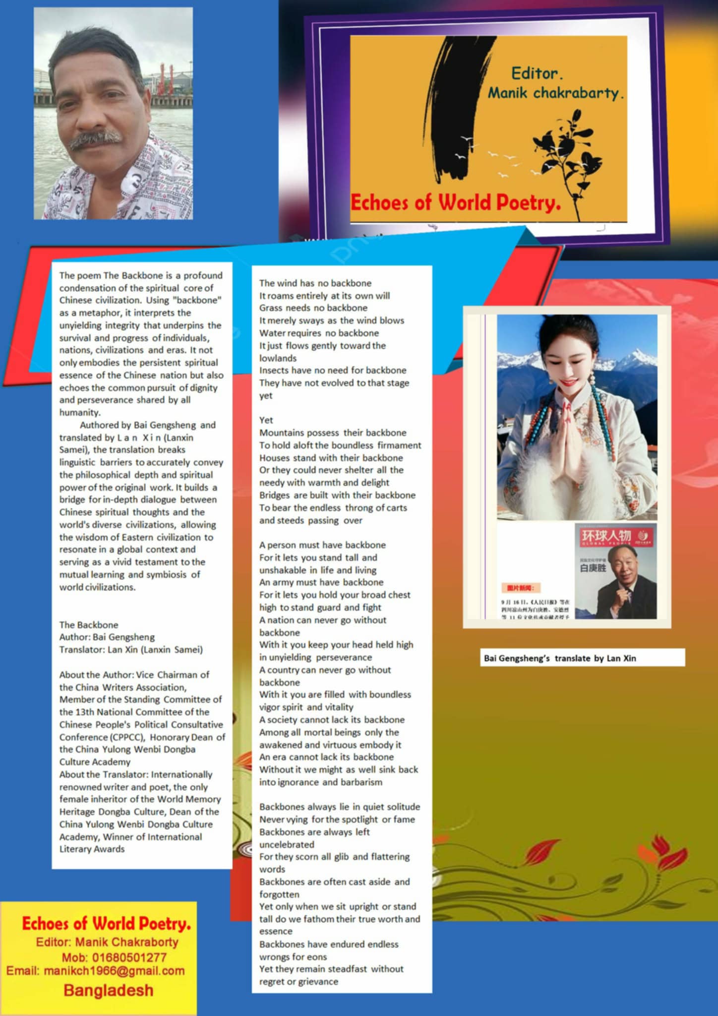 【本会讯】近日,中国作家协会副主席、十三届全国政协常委白庚胜的经典诗作《脊梁》迎来跨国传播的密集高光时刻——1月28日登陆希腊《Polis》国际期刊后,1月30日英译版再度重磅发表于孟加拉国《Echoes of World Poetry》(《世界诗歌回响》)期刊,短短48小时内跨越欧亚两大洲、三大文化区域,以诗意之力搭建起东西方文明对话的新桥梁。