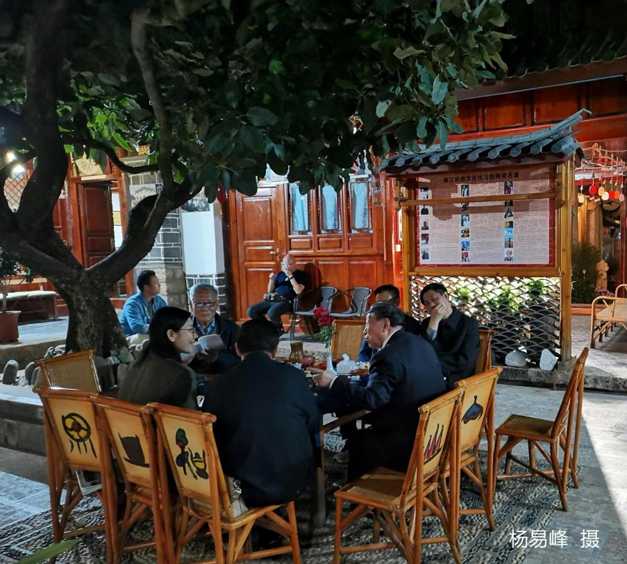 抬头举目处,接风楼飞檐玲珑,古色古香,居山翘楚。“接风楼”三字匾额悬户高拱,门户两侧绘制着一副趋于扁形的大幅碑字对联:“鉴古而彰史道明珠振艺昌文辉广宇,凌高以接天风紫气雕功筑梦壮名邦”。此时的门庭上,还张挂着“丽江民族民间歌舞乐展演”红色横幅和“丽江民族文化传习院”木匾牌。走近楼庭,一道屏风映入眼帘,在庄重而飘逸的“中国最美家庭·百年音乐世家欢迎您”的招唤语下,背衬着丽江古城山水、穿戴着鲜艳纳西族服饰的三女两男的五口之家合照,向宾客送来扑面的其乐融融的诚笃与充盈的情意。步入庭院,让人依旧感觉到装饰一新的四方式大合院,古朴典雅,匠心独运,艺魂丰沛。演艺台、藏展厅、研习房、荣誉室、古籍柜、艺馨窗等,令人目不暇接。一棵生枝茁壮、树系发达、向光躬身探升,让人一时叫不上名来的大古树,其茂密的树荫几乎遮盖住了半边庭空,给整个古朴金色的四合院殿,增添了蓬勃的生机与活力。大古树下洁净的地面,一方藤椅环围的桌台上点缀着盘盘果品与本本书典。更有拎拉着行囊的攘攘游客倘佯于此,留连其间……