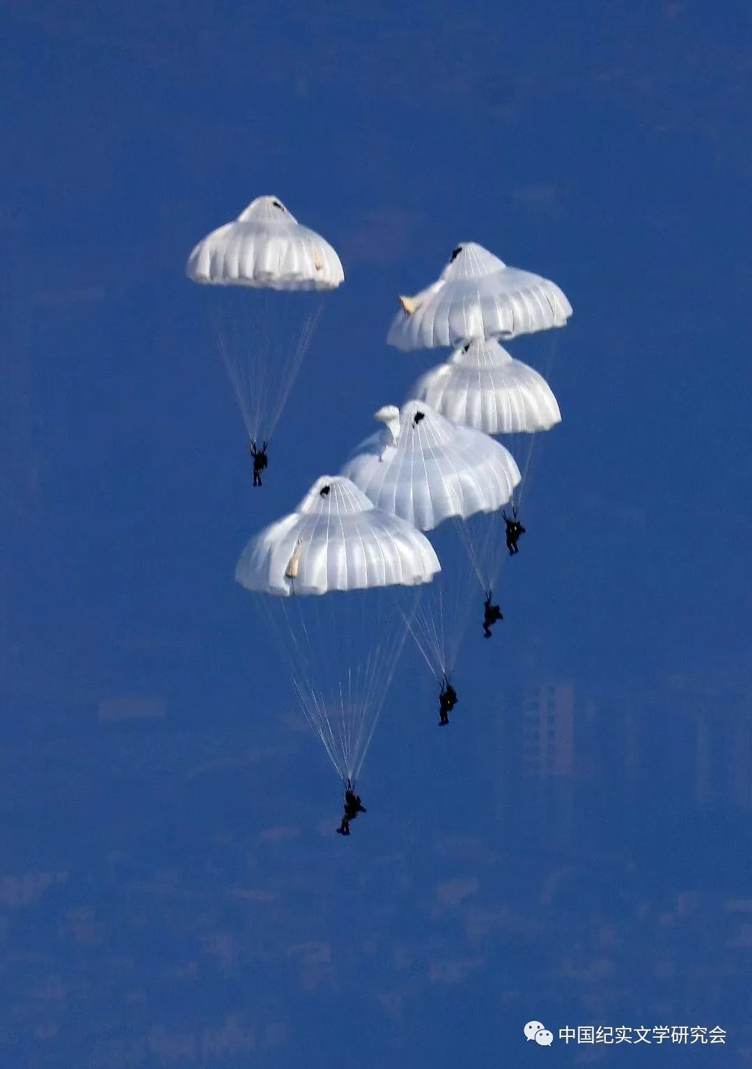 在我相机的镜头里,他们跳伞的动作是那样的英勇无畏、干脆潇洒、轻松娴熟,矫健的身姿美轮美奂。刹那间,一团团伞花在蓝天白云间绽放,恰似漂浮行走于天空的一朵朵巨大的雪莲花。
