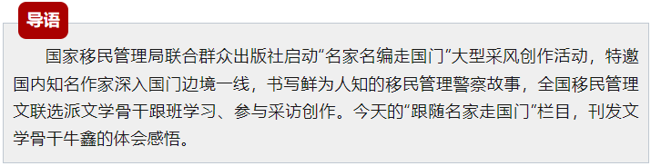 得知要陪同著名军旅作家、首届鲁迅文学奖获得者董保存老师采访第二届“十大国门卫士”黄健,我内心久久不能平静,作为基层政工干部、文学爱好者,能和名家学习交流,机会实属难得。在紧张兴奋中,终于等到了相逢的那一刻。