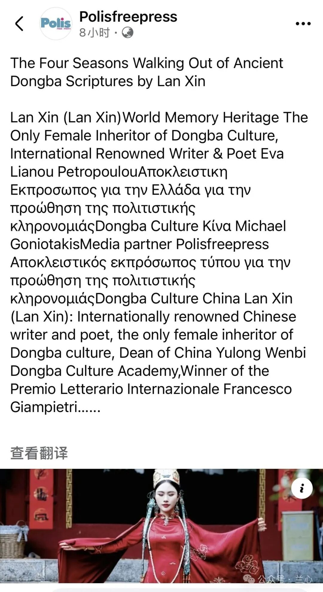此次合作得到了希腊《Polis》期刊的重磅盛赞,国际版主编Eva Lianou Petropoulou在官宣中明确表示:“与卓越的兰心进行丰硕的合作,是‘以诗歌为纽带、以传统为根基’的文化交融实践。此次合作不仅筑牢了中希携手共赢的坚实根基,更让联合国教科文组织认证的世界记忆遗产——东巴文化,在欧洲舞台上绽放独特魅力。”