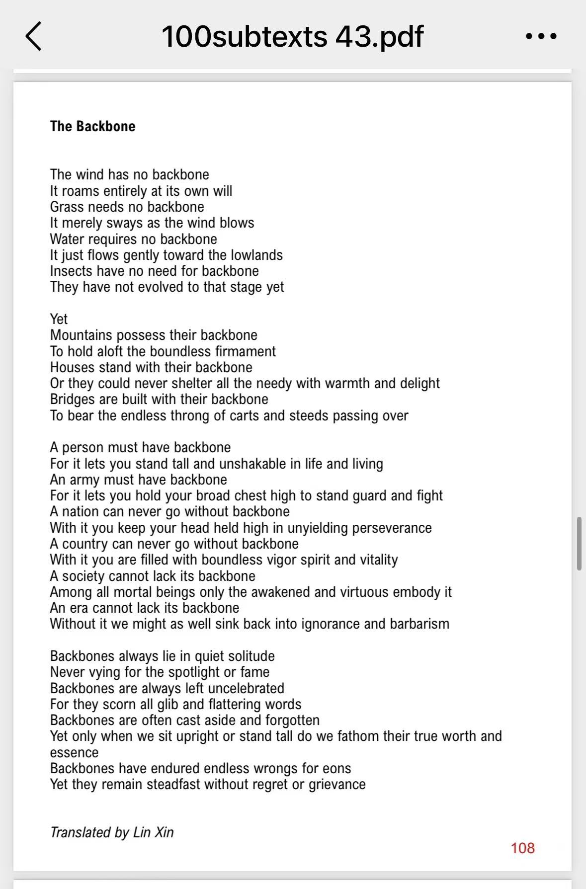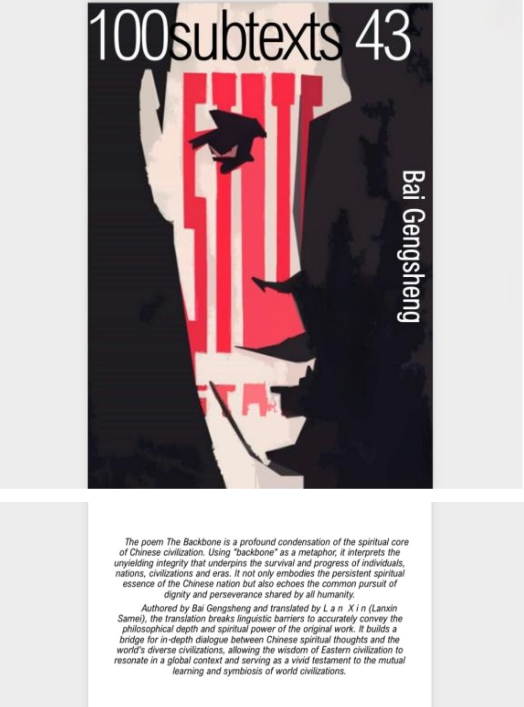 《100subtexts》作为英语世界极具影响力的独立国际文学平台,立足欧洲、辐射全球,以高水准的内容甄选与多元的文化视野著称。该刊第43期全刊近240页,汇集了全球32位当代作家的77篇佳作,是展现世界文学当代风貌的重要载体,在国际文坛拥有广泛的专业认可度与读者基础。此次《脊梁》成功登陆英国顶级文学平台,既是对作品艺术价值的高度认可,也是中国当代文学融入世界文学格局的有力见证。
